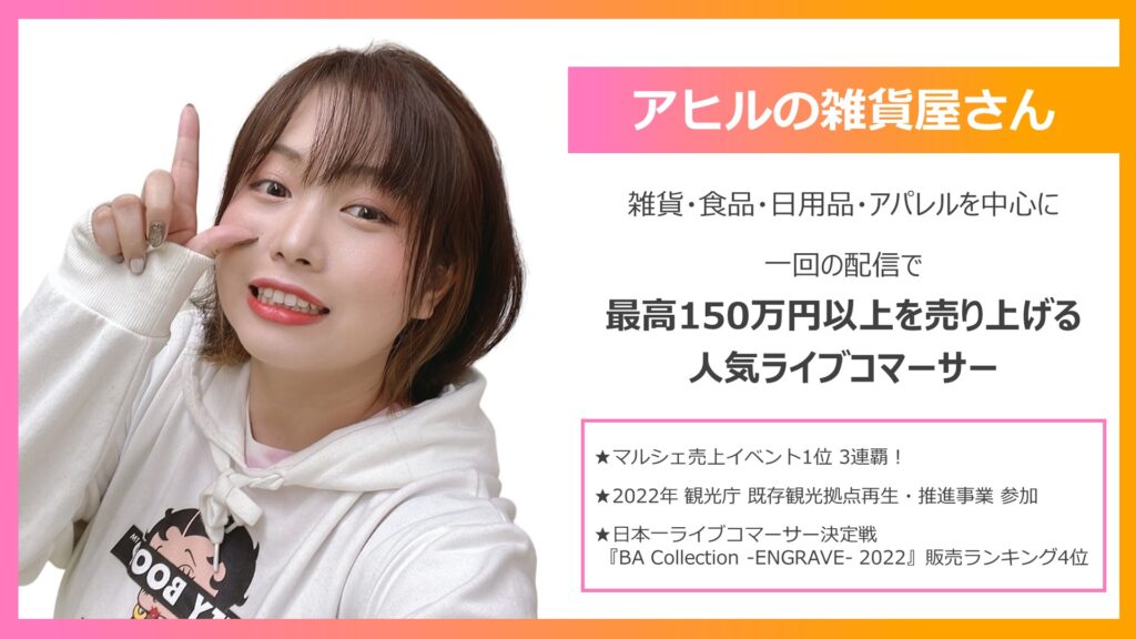 「アヒルの雑貨屋さん」は一回の配信で平均40万円以上、最高150万円以上を販売する人気ライブコマーサーです。