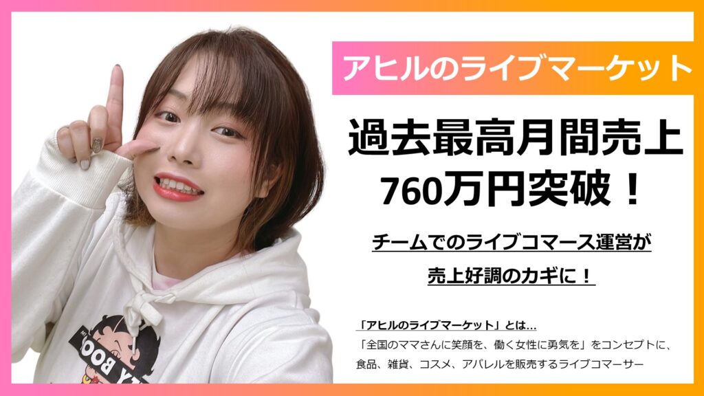 「アヒルのライブマーケット」として、ライブコマース専門事務所「セレスト」に所属したことをきっかけに、様々な業務を専門的に行うスタッフのサポートを元に、配信ごとに改善を繰り返すことで売上を伸ばしてきました。