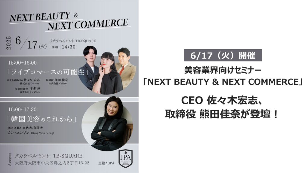 日本におけるライブコマースのインフラ化を目指す株式会社Cellest(本社:大阪府大阪市、代表取締役CEO:佐々木 宏志、以下当社)は、2025年6月17日(火)、一般社団法人日本美容改革推進協会(所在地:大阪府大阪市、代表理事:坂口貴徳、以下JPA)が主催する美容業界向けセミナー「NEXT BEAUTY & NEXT COMMERCE」に、当社代表取締役CEO 佐々木宏志と取締役 熊田佳奈が登壇することをお知らせします。